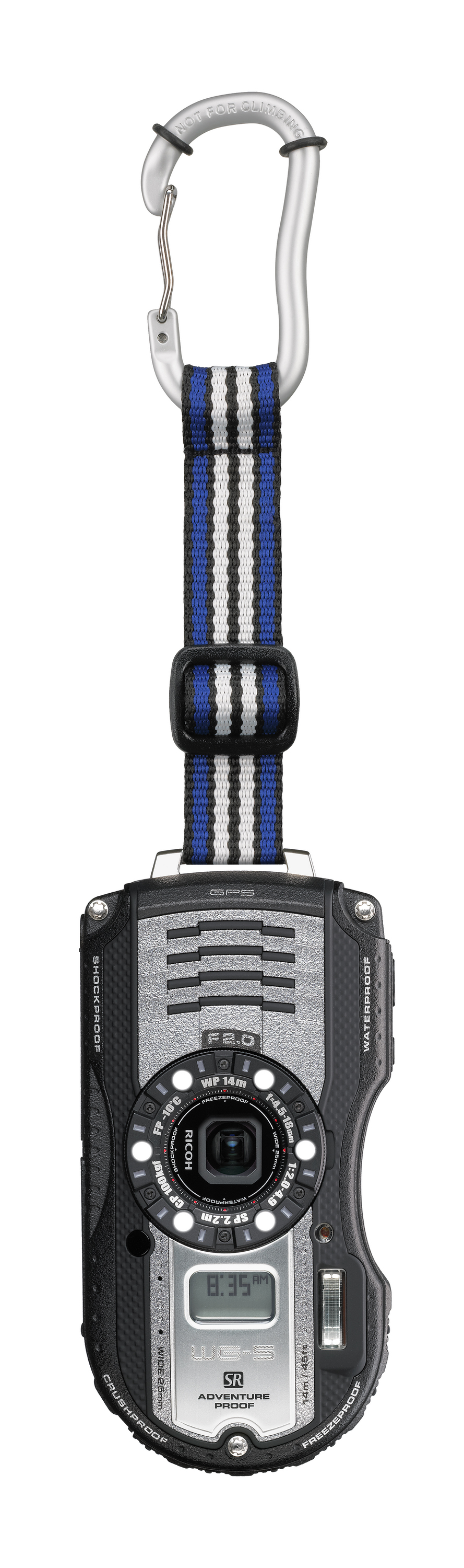 - Входящий в комплект ремешок с карабином позволяет удобно и быстро закрепить камеру на рюкзаке, поясном ремне и другом снаряжении.