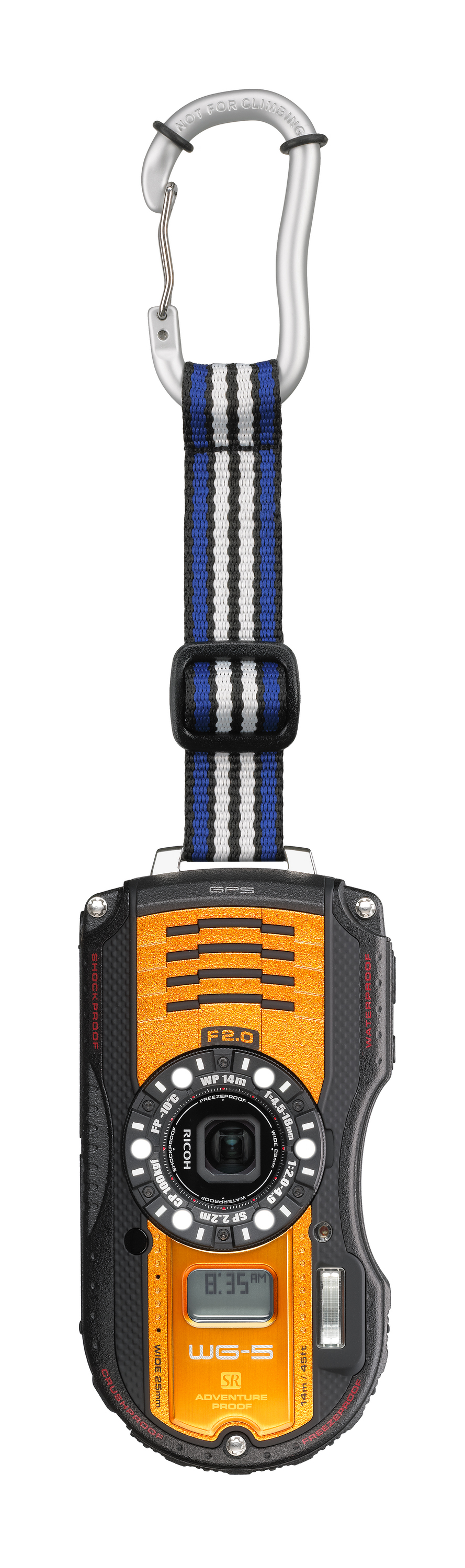 RICOH WG-5 GPS разрабатывался как высококлассная модель линейки цифровых водонепроницаемых компактных камер RICOH и может выдержать погружение в воду до 14 метров, падение с высоты до 2,2 метров, а также устойчив к низким температурам до -10°C. Благодаря сочетанию светосильного объектива (максимальное относительное отверстие f /2.0) с 4х оптическим зумом и высокочувствительной КМОП матрицей с обратной засветкой, камера делает снимки высокого качества без шумов, даже при съемке плохо освещенных объектов, например, подводных сцен, ночных пейзажей и различных спортивных мероприятий в помещениях и на открытом воздухе. Также, модель включает в себя несколько новых особенностей, которые позволяют получить отличные снимки в любой ситуации. Среди них: оптимизация баланса белого в зависимости от места съемки; специальный режим вспышки для подводной съемки; стили съемки Vibrant и Reversal Film, приобрели популярность среди пользователей цифровых зеркальных камер PENTAX. Технические характеристики камеры вполне соответствуют компактам высокого класса, это и превосходный объектив, и двойная стабилизация, запись видео в режиме Full HD (1920 x 1080 пикселей) и 3-дюймовый широкоформатный LCD экран. WG-5 GPS оснащена так же приемником данных со спутников глобального позиционирования и умеет записывать информацию о месте ведения съемки в EXIF-данные снимка. В добавок ко всему, камера оснащена альтиметром/барометром/глубиномером и цифровым компасом. Дизайн модели WG-5 GPS продолжает удачную концепцию «внедорожных» камер RICOH – корпус, который очень удобно удерживать влажной рукой или рукой в перчатке, расположение объектива и вспышки, которые невозможно случайно закрыть пальцем в процессе съемки, продуманное расположение органов управления. Камера выпускается в двух цветовых оттенках: сочный оранжевый и серебристый металлик.